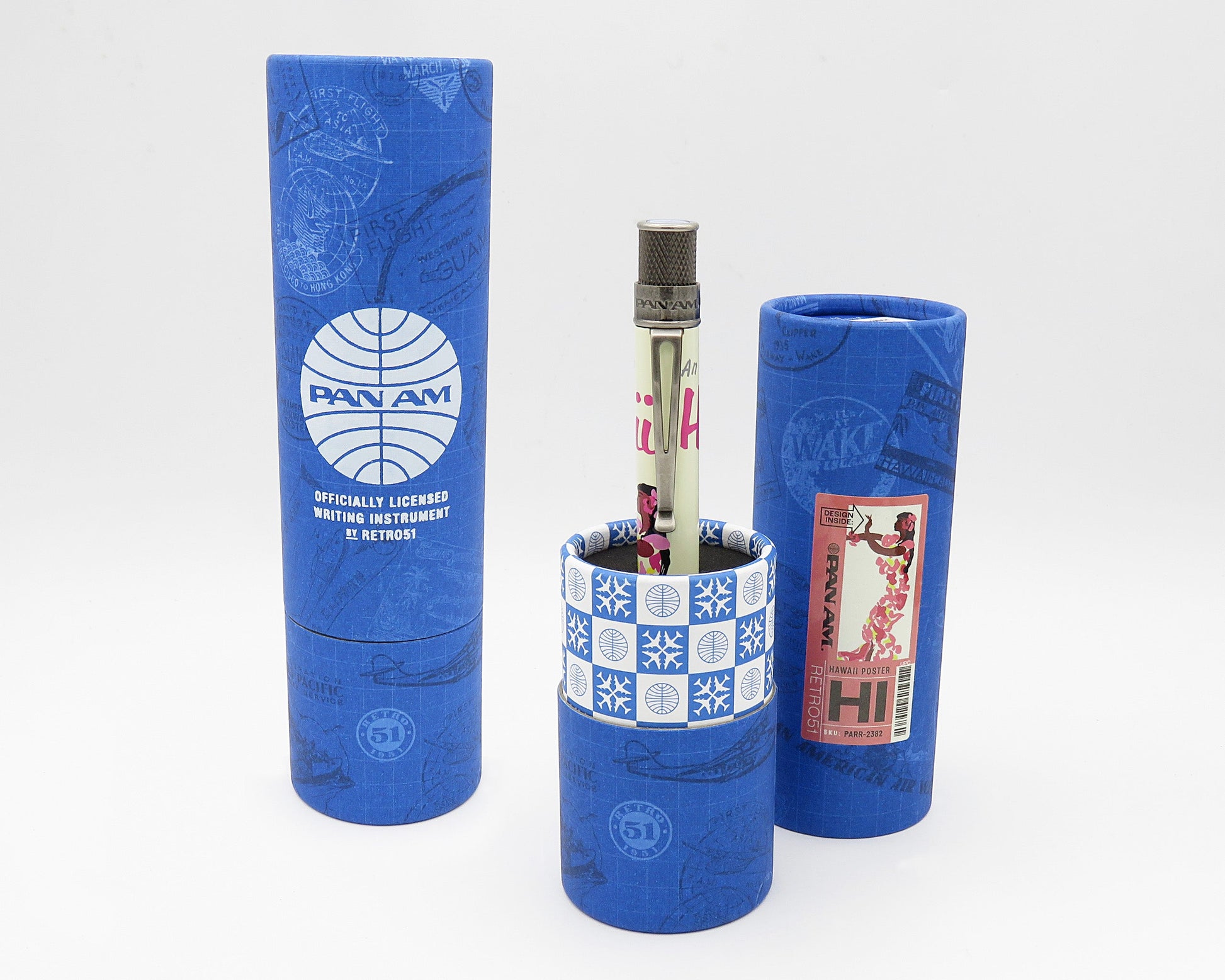 Come fly away on an adventure of a lifetime to Hawaii. We are now boarding for a unique writing experience with the new Officially Licensed Pan Am® designs starting with the Hawaii Travel Poster. This design is taken from one of these travel ads featuring a hula dancer printed on the barrel and accented with stonewashed pewter trim and the iconic Pan Am logo on the top disc. This rollerball comes in branded tube packaging perfect for throwing in your carry-on. Step back in time and dream of your next vacation destination with this Pan Am Tornado™ pen.