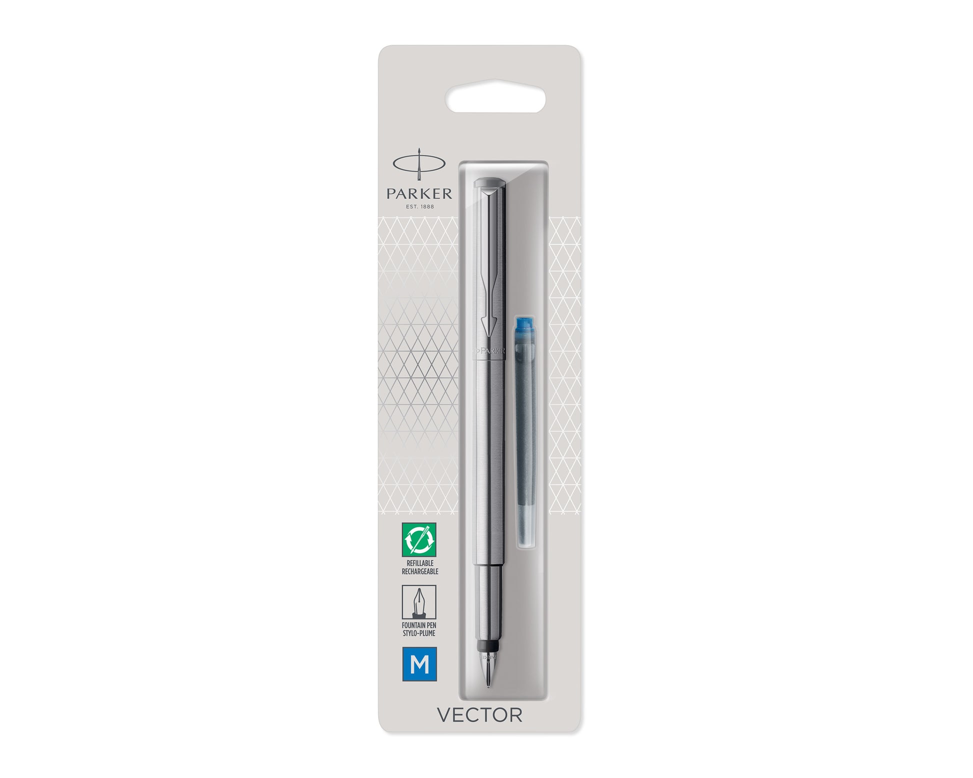 The Parker Vector Stainless Steel Fountain Pen exemplifies Parker's commitment to quality and reliability, making it a dependable choice for everyday writing needs. Its brushed stainless steel finish and chrome-plated trims offer a classic and timeless appeal.