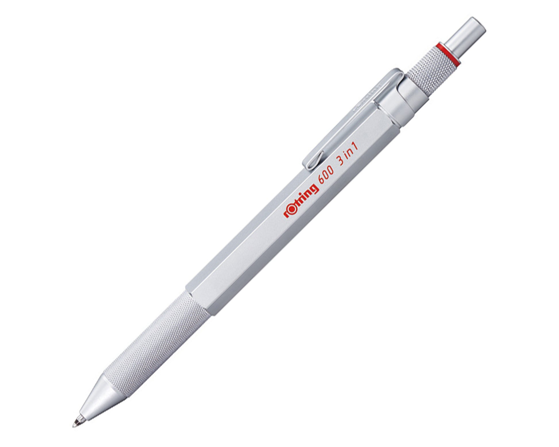 The Rotring 600 3-in-1 Multi Pen in Silver seamlessly combines functionality with the iconic Rotring design, offering a versatile writing instrument for professionals and enthusiasts. This multi pen integrates two fine ballpoint pen tips—black and red ink—and a 0.5 mm mechanical pencil, allowing for effortless switching between writing modes. The full metal body, featuring a hexagonal barrel and knurled grip, ensures durability and a comfortable writing experience. The brass mechanism delivers precise lead advancement, while the fixed lead guidance sleeve prevents breakage and offers an unobstructed view for accurate ruler-based drawing.