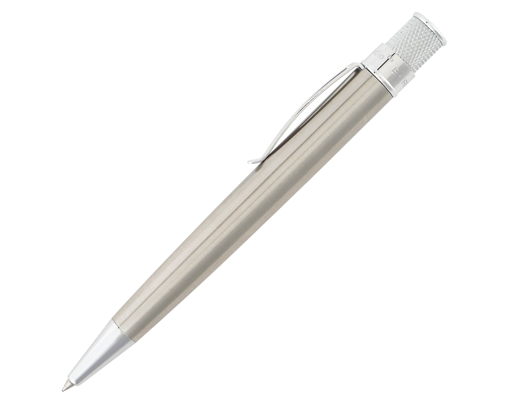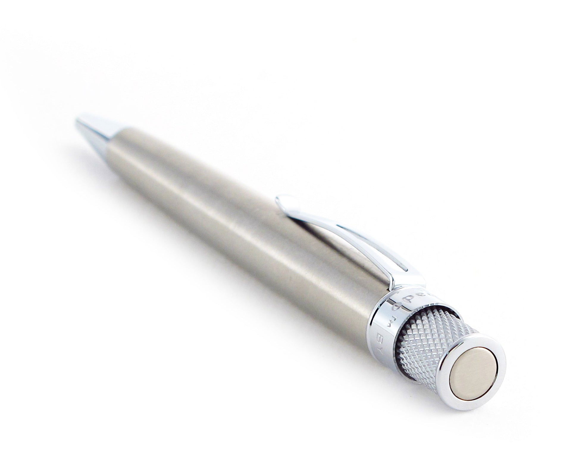 The Tornado Classic Stainless Rollerball pen features a stainless steel barrel with a vibrant metallic lacquer, chrome accents and a trademarked knurled twist top for the retractable rollerball refill.