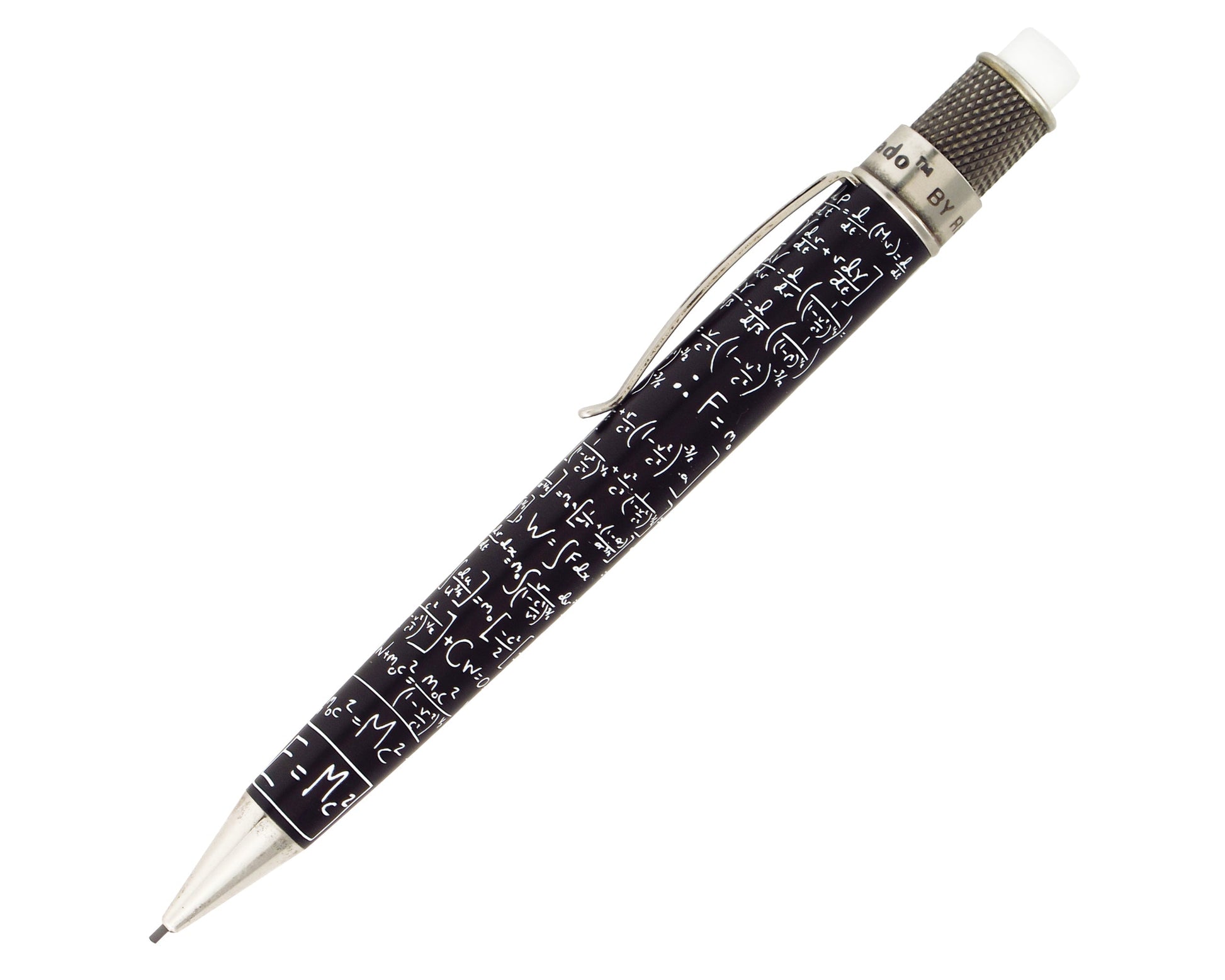 The Albert pencil features a matte black lacquer finish over stainless steel, accented with antiqued trim, and Einstein's equations written in white. The most recognized one being the mass-energy equivalence equation: E=mc2. These 1.15mm pencils operate with a simple twist of the top, plus there is a a huge eraser on top for those who make an occassional mistake. Each pencil comes packaged in a graphic tube wih extra lead and erasers.
