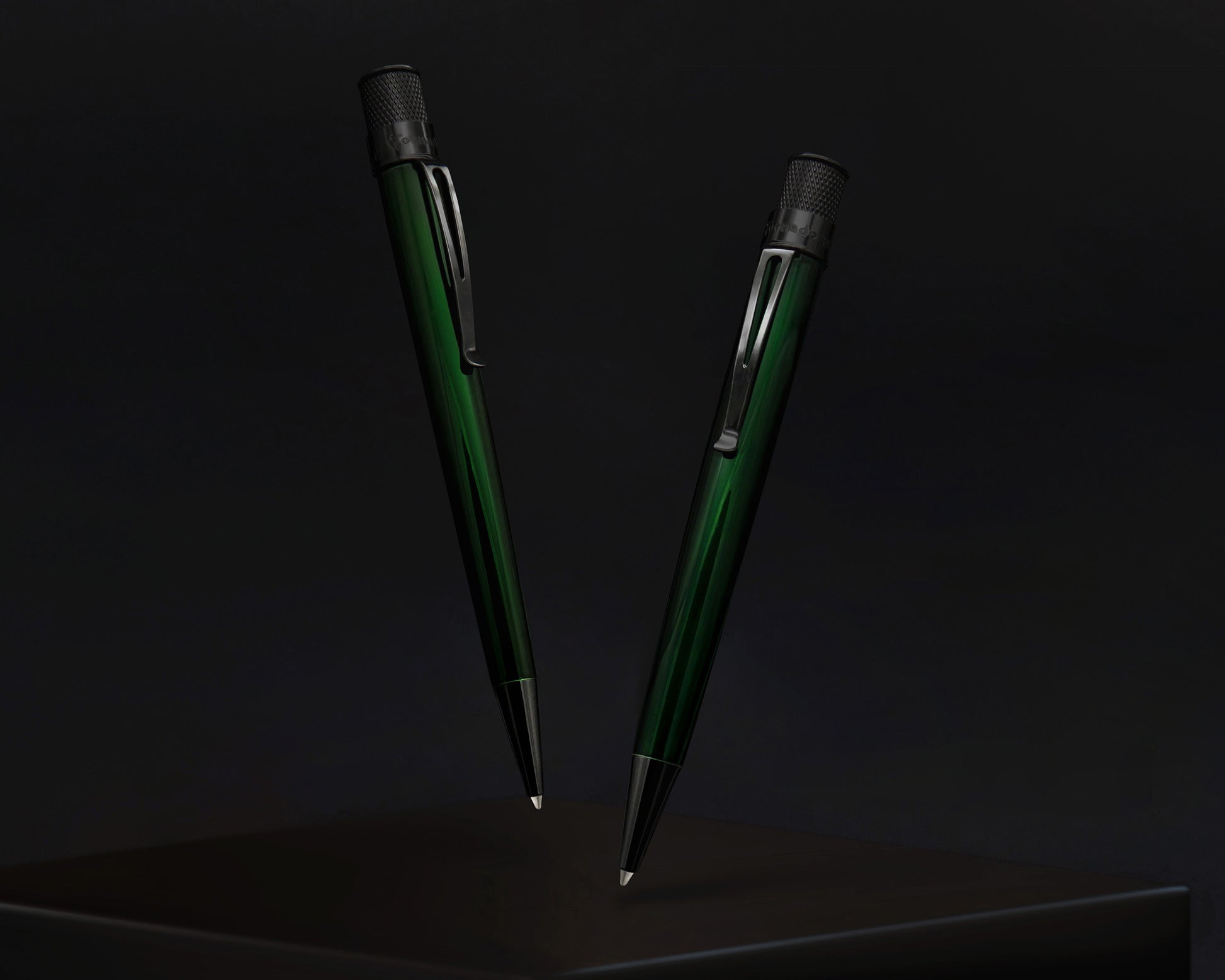 The Stealth Lacquer Collection expands with its latest addition — Emerald. This deep green lacquer paired with glossy black accents evokes a sense of refined luxury, reminiscent of a precious gemstone. Shadows and highlights dance along the tapered barrel, revealing dramatic tones that grow darker or lighter as you turn it in hand. The Tornado rollerball comes fitted with a smooth black ink refill that is finished with a matching green top disc. Each pen is packaged in a Retro-branded tube, perfect for both storage and gifting.